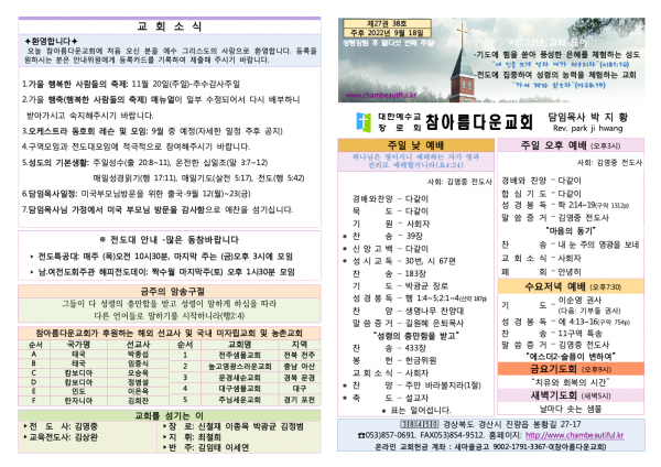 주보-2022년 9월 18일 페이지 정보 작성자 참아름다운교회 댓글 0건 조회 3,954회 22-09-17 17:54 본문 주보-2022년 9월 18일 목 록 답 변 이전글주보-2022년 9월 25일 22.09.24 다음글주보-2022년 9월 11일 22.09.10 댓글목록 댓글목록 등록된 댓글이 없습니다.
