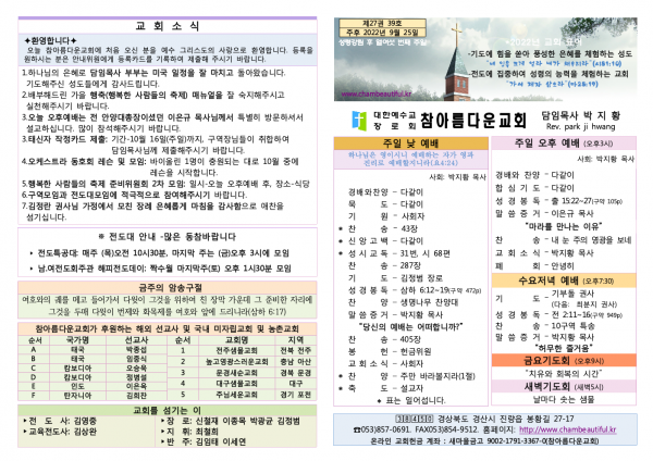 주보-2022년 9월 25일 페이지 정보 작성자 참아름다운교회 댓글 0건 조회 3,890회 22-09-24 23:03 본문 주보-2022년 9월 25일 목 록 답 변 이전글주보-2022년 10월 2일 22.10.01 다음글주보-2022년 9월 18일 22.09.17 댓글목록 댓글목록 등록된 댓글이 없습니다.