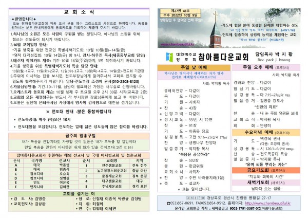 주보-2022년 10월 9일 페이지 정보 작성자 참아름다운교회 댓글 0건 조회 3,976회 22-10-08 13:41 본문 주보-2022년 10월 9일 목 록 답 변 이전글주보-2022년 10월 16일 22.10.15 다음글주보-2022년 10월 2일 22.10.01 댓글목록 댓글목록 등록된 댓글이 없습니다.