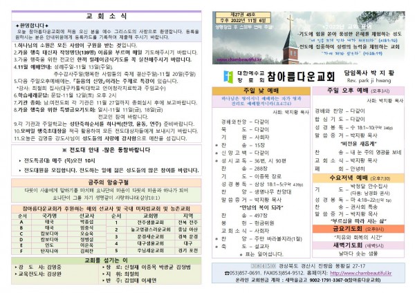 주보-2022년 11월 6일 페이지 정보 작성자 참아름다운교회 댓글 0건 조회 3,855회 22-11-05 11:35 본문 주보-2022년 11월 6일 목 록 답 변 이전글주보-2022년 11월 13일 22.11.12 다음글주보-2022년 10월 30일 22.10.29 댓글목록 댓글목록 등록된 댓글이 없습니다.
