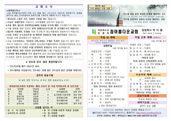 주보-2022년 11월 13일 페이지 정보 작성자 참아름다운교회 댓글 0건 조회 3,881회 22-11-12 10:34 본문 주보-2022년 11월 13일 목 록 답 변 이전글주보-2022년 11월 20일 22.11.19 다음글주보-2022년 11월 6일 22.11.05 댓글목록 댓글목록 등록된 댓글이 없습니다.