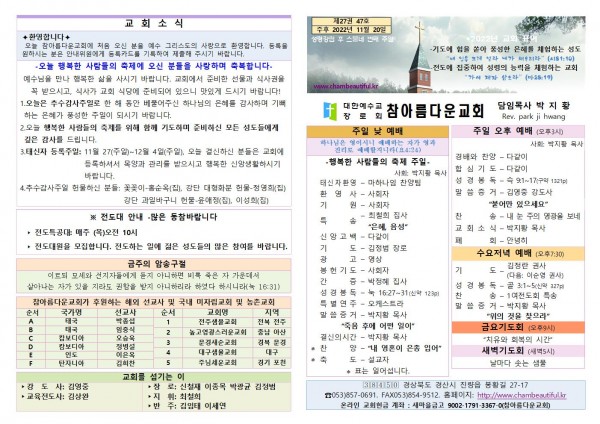 주보-2022년 11월 20일 페이지 정보 작성자 참아름다운교회 댓글 0건 조회 3,929회 22-11-19 13:04 본문 주보-2022년 11월 20일 목 록 답 변 이전글주보-2022년 11월 27일 22.11.26 다음글주보-2022년 11월 13일 22.11.12 댓글목록 댓글목록 등록된 댓글이 없습니다.