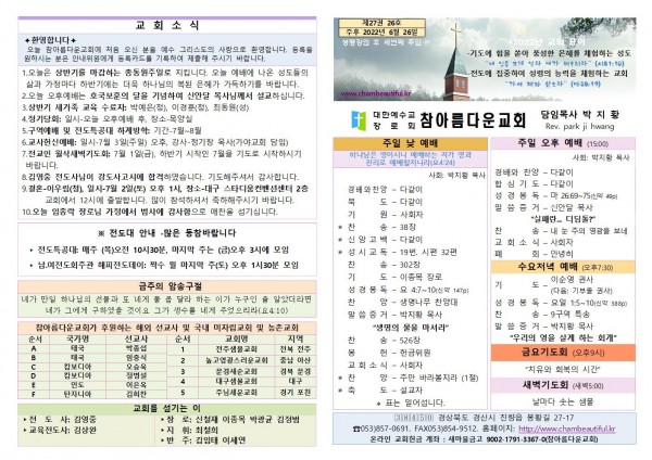 주보-2022년 6월 26일 페이지 정보 작성자 참아름다운교회 댓글 0건 조회 4,063회 22-06-26 14:30 본문 주보-2022년 6월 26일 목 록 답 변 이전글주보-2022년 7월 3일 22.07.03 다음글주보-2022년 6월 19일 22.06.18 댓글목록 댓글목록 등록된 댓글이 없습니다.