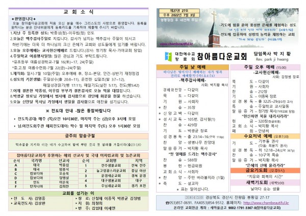주보-2022년 7월 3일 페이지 정보 작성자 참아름다운교회 댓글 0건 조회 4,015회 22-07-03 13:05 본문 주보-2022년 7월 3일 목 록 답 변 이전글주보2022년 7월 10일 22.07.09 다음글주보-2022년 6월 26일 22.06.26 댓글목록 댓글목록 등록된 댓글이 없습니다.