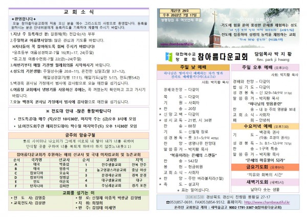 주보-2022년 7월 17일 페이지 정보 작성자 참아름다운교회 댓글 0건 조회 4,060회 22-07-16 21:40 본문 주보-2022년 7월 17일 목 록 답 변 이전글주보-2022년 7월 24일 22.07.22 다음글주보2022년 7월 10일 22.07.09 댓글목록 댓글목록 등록된 댓글이 없습니다.