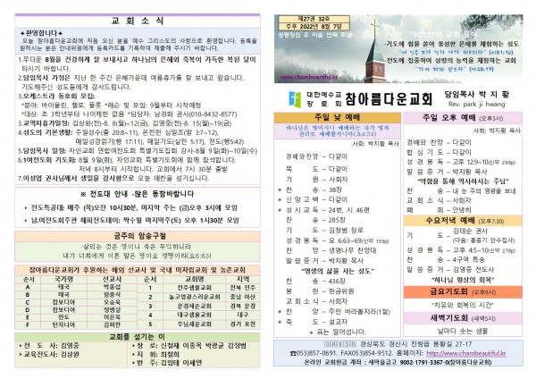 주보-2022년 8월 7일 페이지 정보 작성자 참아름다운교회 댓글 0건 조회 4,040회 22-08-06 13:07 본문 주보-2022년 8월 7일 목 록 답 변 이전글주보-2022년 8월 14일 22.08.13 다음글주보-2022년 7월 31일 22.07.30 댓글목록 댓글목록 등록된 댓글이 없습니다.