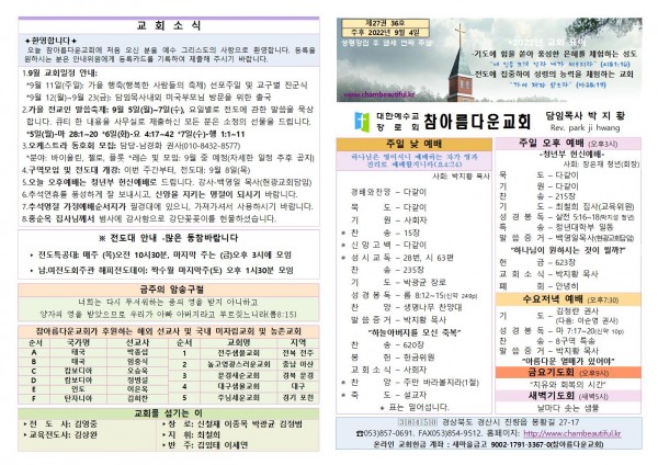 주보-2022년 9월 4일 페이지 정보 작성자 참아름다운교회 댓글 0건 조회 3,972회 22-09-03 11:17 본문 주보-2022년 9월 4일 목 록 답 변 이전글주보-2022년 9월 11일 22.09.10 다음글주보-2022년 8월 28일 22.08.27 댓글목록 댓글목록 등록된 댓글이 없습니다.