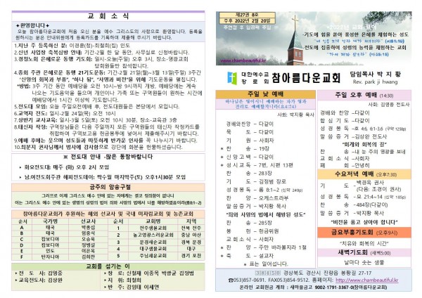 주보-2022년 2월 20일 페이지 정보 작성자 참아름다운교회 댓글 0건 조회 4,428회 22-02-19 18:02 본문 주보-2022년 2월 20일 목 록 답 변 이전글주보-2022년 2월 27일 22.02.26 다음글주보-2022년 2월 13일 22.02.18 댓글목록 댓글목록 등록된 댓글이 없습니다.