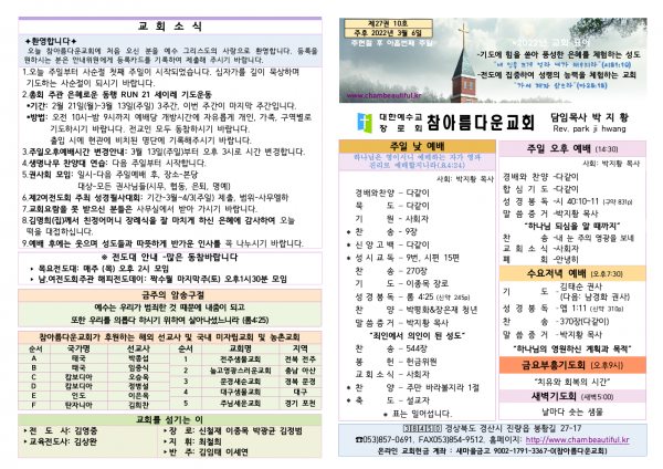 주보-2022년 3월 6일 페이지 정보 작성자 참아름다운교회 댓글 0건 조회 4,322회 22-03-05 23:26 본문 주보-2022년 3월 6일 목 록 답 변 이전글주보-2022년 3월 13일 22.03.12 다음글주보-2022년 2월 27일 22.02.26 댓글목록 댓글목록 등록된 댓글이 없습니다.