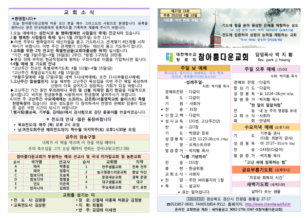 주보-2022년 4월 10일 페이지 정보 작성자 참아름다운교회 댓글 0건 조회 4,294회 22-04-09 17:39 본문 주보-2022년 4월 10일 목 록 답 변 이전글주보-2022년 4월 17일 22.04.16 다음글주보-2022년 4월 3일 22.04.03 댓글목록 댓글목록 등록된 댓글이 없습니다.