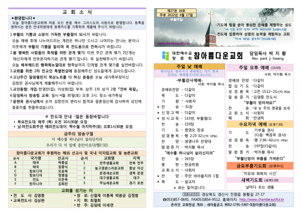 주보-2022년 4월 17일 페이지 정보 작성자 참아름다운교회 댓글 0건 조회 4,294회 22-04-16 23:06 본문 주보-2022년 4월 17일 목 록 답 변 이전글주보-2022년 4월 24일 22.04.23 다음글주보-2022년 4월 10일 22.04.09 댓글목록 댓글목록 등록된 댓글이 없습니다.