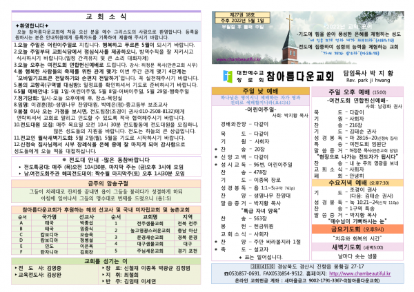 주보-2022년 5월 1일 페이지 정보 작성자 참아름다운교회 댓글 0건 조회 4,264회 22-05-03 20:43 본문 주보-2022년 5월 1일 목 록 답 변 이전글주보-2022년 5월 8일 22.05.07 다음글주보-2022년 4월 24일 22.04.23 댓글목록 댓글목록 등록된 댓글이 없습니다.