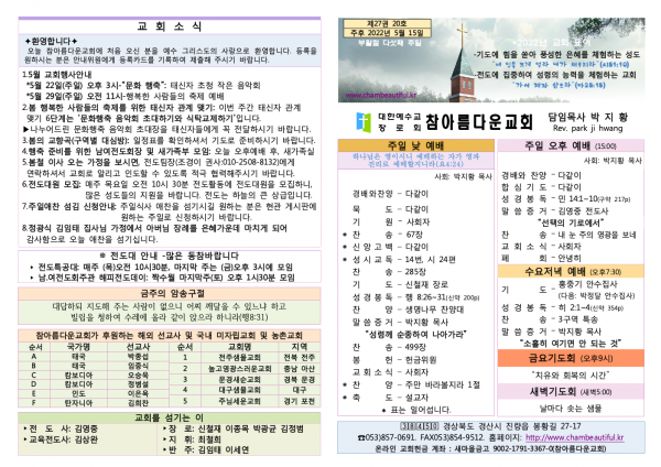 주보-2022년 5월 15일 페이지 정보 작성자 참아름다운교회 댓글 0건 조회 4,259회 22-05-14 21:58 본문 주보-2022년 5월 15일 목 록 답 변 이전글주보-2022년 5월 22일 22.05.21 다음글주보-2022년 5월 8일 22.05.07 댓글목록 댓글목록 등록된 댓글이 없습니다.