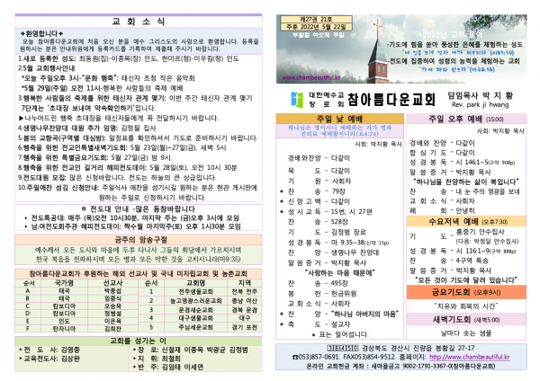 주보-2022년 5월 22일 페이지 정보 작성자 참아름다운교회 댓글 0건 조회 4,219회 22-05-21 16:33 본문 주보-2022년 5월 22일 목 록 답 변 이전글주보-2022년 5월 29일 22.05.28 다음글주보-2022년 5월 15일 22.05.14 댓글목록 댓글목록 등록된 댓글이 없습니다.