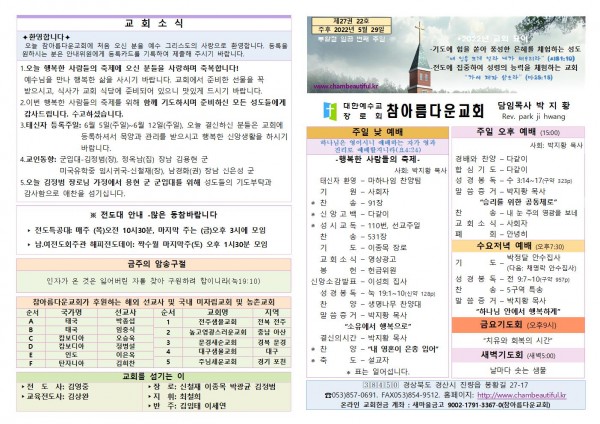 주보-2022년 5월 29일 페이지 정보 작성자 참아름다운교회 댓글 0건 조회 4,155회 22-05-28 12:38 본문 주보-2022년 5월 29일 목 록 답 변 이전글주보-2022년 6월 5일 22.06.04 다음글주보-2022년 5월 22일 22.05.21 댓글목록 댓글목록 등록된 댓글이 없습니다.