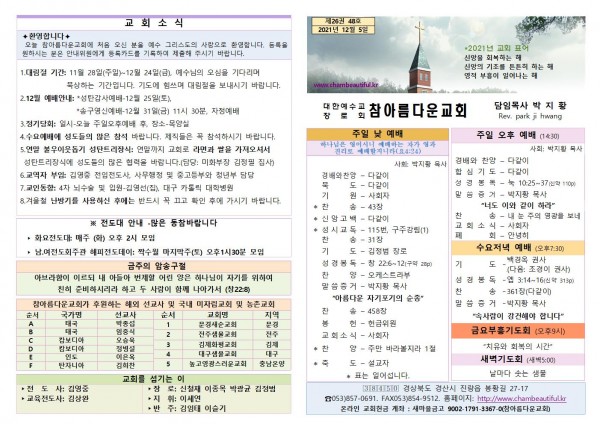 주보-2021년 12월 5일 페이지 정보 작성자 참아름다운교회 댓글 0건 조회 4,731회 21-12-04 13:42 본문 주보-2021년 12월 5일 목 록 답 변 이전글주보-2021년 12월 12일 21.12.11 다음글주보-2021년 11월 28일 21.11.27 댓글목록 댓글목록 등록된 댓글이 없습니다.