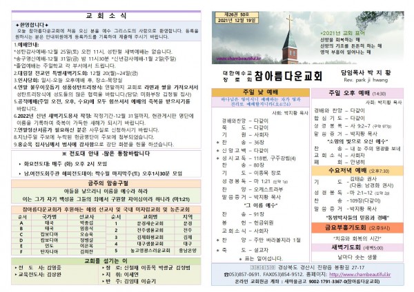주보-2021년 12월 19일 페이지 정보 작성자 참아름다운교회 댓글 0건 조회 4,704회 21-12-18 14:42 본문 주보-2021년 12월 19일12월 5일(주일) 향기로운 예물 명단 목 록 답 변 이전글주보-2021년 12월 26일 21.12.25 다음글주보-2021년 12월 12일 21.12.11 댓글목록 댓글목록 등록된 댓글이 없습니다.