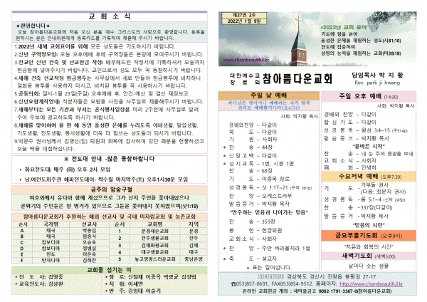 주보-2022년 1월 9일 페이지 정보 작성자 참아름다운교회 댓글 0건 조회 4,591회 22-01-08 16:55 본문 주보-2022년 1월 9일 목 록 답 변 이전글주보-2022년 1월 16일 22.01.15 다음글주보-2022년 1월 2일 22.01.01 댓글목록 댓글목록 등록된 댓글이 없습니다.