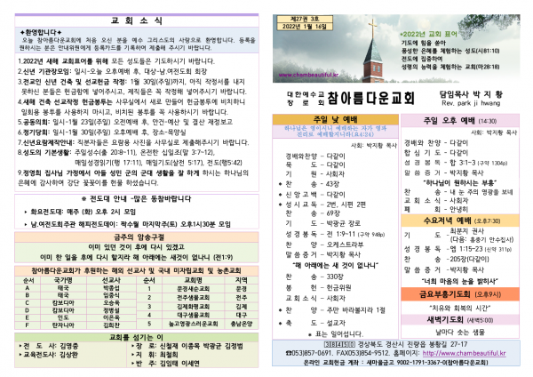 주보-2022년 1월 16일 페이지 정보 작성자 참아름다운교회 댓글 0건 조회 4,609회 22-01-15 21:26 본문 주보-2022년 1월 16일 목 록 답 변 이전글주보-2022년 1월 23일 22.01.22 다음글주보-2022년 1월 9일 22.01.08 댓글목록 댓글목록 등록된 댓글이 없습니다.