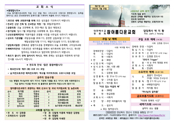 주보-2022년 1월 23일 페이지 정보 작성자 참아름다운교회 댓글 0건 조회 4,612회 22-01-22 18:57 본문 주보-2022년 1월 23일 목 록 답 변 이전글주보-2022년 1월 30일 22.01.29 다음글주보-2022년 1월 16일 22.01.15 댓글목록 댓글목록 등록된 댓글이 없습니다.