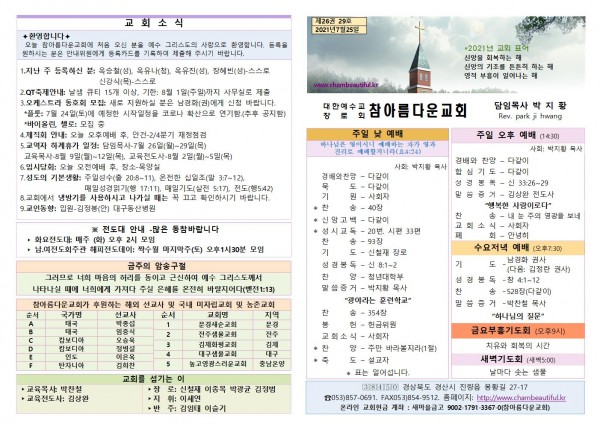 주보-2021년 7월 25일 페이지 정보 작성자 참아름다운교회 댓글 0건 조회 5,139회 21-07-24 13:37 본문 주보-2021년 7월 25일 목 록 답 변 이전글주보-2021년 8월 1일 21.07.31 다음글주보-2021년 7월 18일 21.07.17 댓글목록 댓글목록 등록된 댓글이 없습니다.