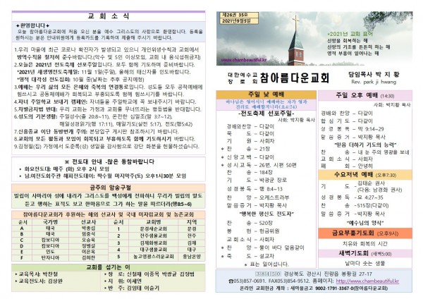 주보-2021년 9월 5일 페이지 정보 작성자 참아름다운교회 댓글 0건 조회 5,125회 21-09-04 15:20 본문 주보-2021년 9월 5일 목 록 답 변 이전글주보-2021년 9월 12일 21.09.11 다음글주보-2021년 8월 29일 21.08.28 댓글목록 댓글목록 등록된 댓글이 없습니다.