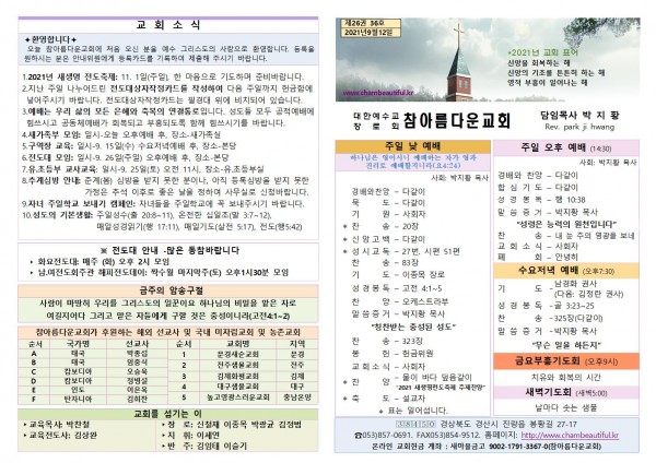 주보-2021년 9월 12일 페이지 정보 작성자 참아름다운교회 댓글 0건 조회 5,060회 21-09-11 14:46 본문 주보-2021년 9월 12일 목 록 답 변 이전글주보-2021년 9월 19일 21.09.18 다음글주보-2021년 9월 5일 21.09.04 댓글목록 댓글목록 등록된 댓글이 없습니다.