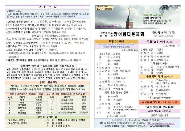 주보-2021년 10월 10일 페이지 정보 작성자 참아름다운교회 댓글 0건 조회 4,987회 21-10-09 14:19 본문 주보-2021년 10월 10일 목 록 답 변 이전글주보-2021년 10월 17일 21.10.16 다음글주보-2021년 10월 3일 21.10.02 댓글목록 댓글목록 등록된 댓글이 없습니다.