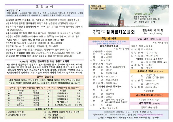 주보-2021년 10월 24일 페이지 정보 작성자 참아름다운교회 댓글 0건 조회 4,894회 21-10-23 11:43 본문 주보-2021년 10월 24일 목 록 답 변 이전글주보-2021년 10월 31일 21.10.30 다음글주보-2021년 10월 17일 21.10.16 댓글목록 댓글목록 등록된 댓글이 없습니다.