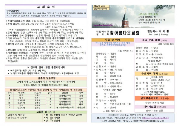 주보-2021년 4월 11일 페이지 정보 작성자 참아름다운교회 댓글 0건 조회 5,541회 21-04-10 14:26 본문 주보-2021년 4월 11일 목 록 답 변 이전글주보-2021년 4월 18일 21.04.17 다음글주보-2021년 4월 4일 21.04.03 댓글목록 댓글목록 등록된 댓글이 없습니다.