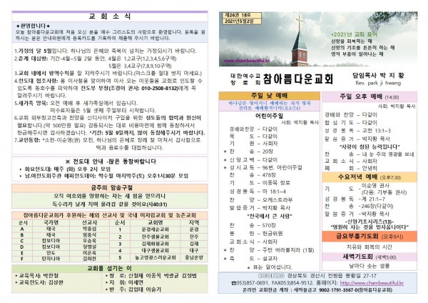 주보-2021년 5월 2일 페이지 정보 작성자 참아름다운교회 댓글 0건 조회 5,437회 21-05-01 15:02 본문 주보-2021년 5월 2일 목 록 답 변 이전글주보-2021년 5월 9일 21.05.08 다음글주보-2021년 4월 25일 21.04.24 댓글목록 댓글목록 등록된 댓글이 없습니다.