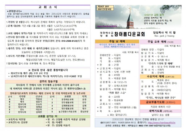 주보-2021년 5월 16일 페이지 정보 작성자 참아름다운교회 댓글 0건 조회 5,389회 21-05-15 15:37 본문 주보-2021년 5월 16일 목 록 답 변 이전글주보-2021년 5월 23일 21.05.22 다음글주보-2021년 5월 9일 21.05.08 댓글목록 댓글목록 등록된 댓글이 없습니다.