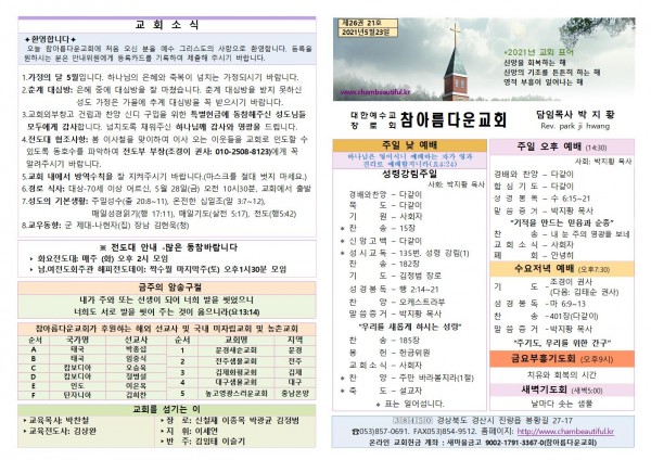 주보-2021년 5월 23일 페이지 정보 작성자 참아름다운교회 댓글 0건 조회 5,476회 21-05-22 14:42 본문 주보-2021년 5월 23일 목 록 답 변 이전글주보-2021년 5월 30일 21.05.29 다음글주보-2021년 5월 16일 21.05.15 댓글목록 댓글목록 등록된 댓글이 없습니다.