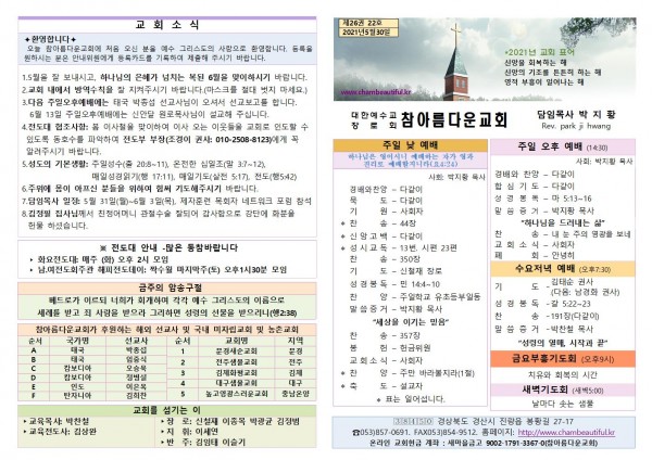 주보-2021년 5월 30일 페이지 정보 작성자 참아름다운교회 댓글 0건 조회 5,485회 21-05-29 13:32 본문 주보-2021년 5월 30일 목 록 답 변 이전글주보-2021년 6월 6일 21.06.05 다음글주보-2021년 5월 23일 21.05.22 댓글목록 댓글목록 등록된 댓글이 없습니다.