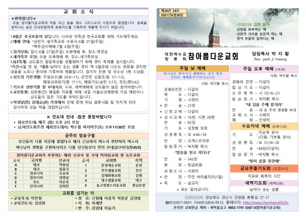 주보-2021년 6월 20일 페이지 정보 작성자 참아름다운교회 댓글 0건 조회 5,264회 21-06-19 13:51 본문 주보-2021년 6월 20일 목 록 답 변 이전글주보-2021년 6월 27일 21.06.26 다음글주보-2021년 6월 13일 21.06.12 댓글목록 댓글목록 등록된 댓글이 없습니다.