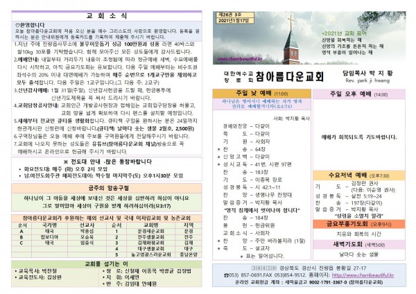 주보-2021년 1월 17일 페이지 정보 작성자 참아름다운교회 댓글 0건 조회 6,213회 21-01-16 14:23 본문 주보-2021년 1월 17일 목 록 답 변 이전글주보-2021년 1월 24일 21.01.23 다음글주보-2021년 1월 10일 21.01.09 댓글목록 댓글목록 등록된 댓글이 없습니다.