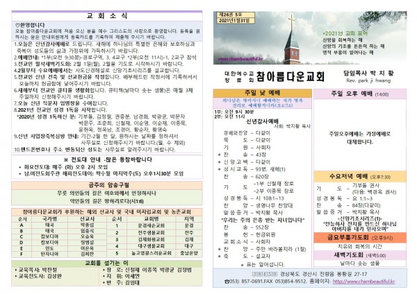주보-2021년 1월 31일 페이지 정보 작성자 참아름다운교회 댓글 0건 조회 5,923회 21-01-30 15:19 본문 주보-2021년 1월 31일 목 록 답 변 이전글주보-2021년 2월 7일 21.02.06 다음글주보-2021년 1월 24일 21.01.23 댓글목록 댓글목록 등록된 댓글이 없습니다.