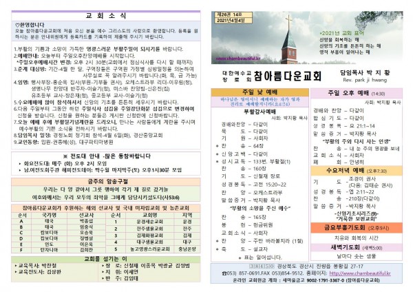 주보-2021년 4월 4일 페이지 정보 작성자 참아름다운교회 댓글 0건 조회 5,607회 21-04-03 14:13 본문 주보-2021년 4월 4일 목 록 답 변 이전글주보-2021년 4월 11일 21.04.10 다음글주보-2021년 3월 28일 21.03.27 댓글목록 댓글목록 등록된 댓글이 없습니다.