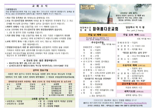주보-2020년 11월 15일 페이지 정보 작성자 참아름다운교회 댓글 0건 조회 6,365회 20-11-14 13:20 본문 주보-2020년 11월 15일 목 록 답 변 이전글주보-2020년 11월 22일 20.11.21 다음글주보-2020년 11월 8일 20.11.08 댓글목록 댓글목록 등록된 댓글이 없습니다.