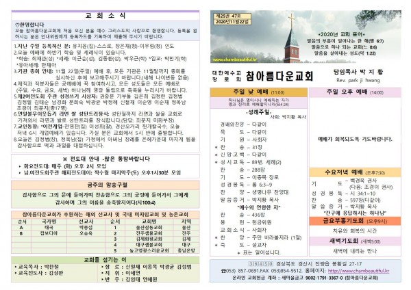 주보-2020년 11월 22일 페이지 정보 작성자 참아름다운교회 댓글 0건 조회 6,527회 20-11-21 16:59 본문 주보-2020년 11월 22일 목 록 답 변 이전글주보-2020년 11월 29일 20.11.28 다음글주보-2020년 11월 15일 20.11.14 댓글목록 댓글목록 등록된 댓글이 없습니다.