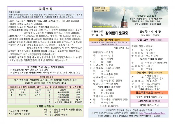 주보-2020년 6월 7일 페이지 정보 작성자 참아름다운교회 댓글 0건 조회 7,614회 20-06-06 15:11 본문 주보-2020년 6월 7일 목 록 답 변 이전글주보-2020년 6월 14일 20.06.14 다음글주보-2020년 5월 31일 20.05.30 댓글목록 댓글목록 등록된 댓글이 없습니다.