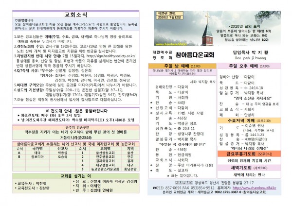 주보-2020년 7월 12일 페이지 정보 작성자 참아름다운교회 댓글 0건 조회 7,100회 20-07-12 13:12 본문 주보-2020년 7월 12일 목 록 답 변 이전글주보-2020년 7월 19일 20.07.18 다음글주보-2020년 7월 5일 20.07.04 댓글목록 댓글목록 등록된 댓글이 없습니다.