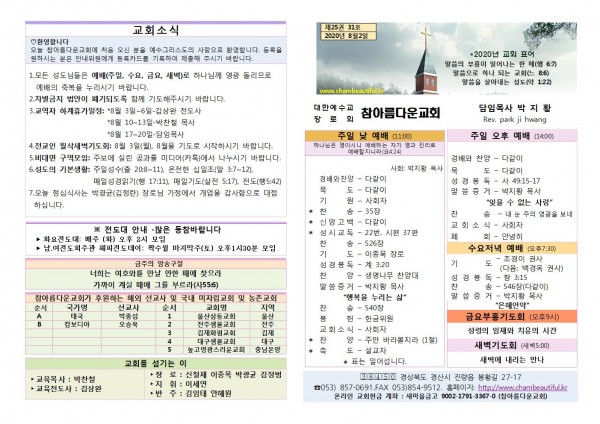 주보-2020년 8월 2일 페이지 정보 작성자 참아름다운교회 댓글 0건 조회 6,965회 20-08-01 14:03 본문 주보-2020년 8월 2일 목 록 답 변 이전글주보-2020년 8월 9일 20.08.09 다음글주보-2020년 7월 26일 20.07.25 댓글목록 댓글목록 등록된 댓글이 없습니다.