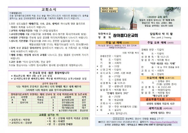 주보-2020년 8월 16일 페이지 정보 작성자 참아름다운교회 댓글 0건 조회 6,902회 20-08-15 13:19 본문 주보-2020년 8월 16일 목 록 답 변 이전글주보-2020년 8월 23일 20.08.22 다음글주보-2020년 8월 9일 20.08.09 댓글목록 댓글목록 등록된 댓글이 없습니다.