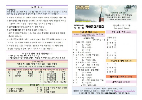 주보-2020년 4월 12일 페이지 정보 작성자 참아름다운교회 댓글 0건 조회 7,718회 20-04-11 13:27 본문 주보-2020년 4월 12일 목 록 답 변 이전글주보-2020년 4월 19일 20.04.18 다음글주보-2020년 4월 5일 20.04.04 댓글목록 댓글목록 등록된 댓글이 없습니다.
