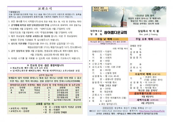 주보-2020년 4월 19일 페이지 정보 작성자 참아름다운교회 댓글 0건 조회 7,694회 20-04-18 13:30 본문 주보-2020년 4월 19일 목 록 답 변 이전글주보-2020년 4월 26일 20.04.25 다음글주보-2020년 4월 12일 20.04.11 댓글목록 댓글목록 등록된 댓글이 없습니다.
