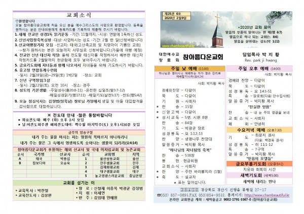 주보- 2020년 2월 9일 페이지 정보 작성자 참아름다운교회 댓글 0건 조회 8,258회 20-02-09 13:39 본문 주보- 2020년 2월 9일 목 록 답 변 이전글주보- 2020년 2월 16일 20.02.16 다음글주보- 2020년 2월 2일 20.02.02 댓글목록 댓글목록 등록된 댓글이 없습니다.