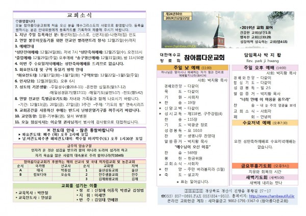 주보- 2019년 12월 22일 페이지 정보 작성자 참아름다운교회 댓글 0건 조회 8,515회 19-12-22 13:45 본문 주보- 2019년 12월 22일 목 록 답 변 이전글주보- 2019년 12월 29일 19.12.29 다음글주보- 2019년 12월 15일 19.12.15 댓글목록 댓글목록 등록된 댓글이 없습니다.