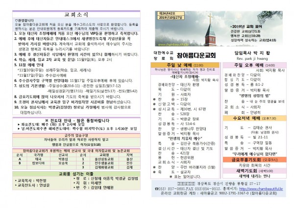 주보- 2019년 10월 27일 페이지 정보 작성자 참아름다운교회 댓글 0건 조회 9,256회 19-10-27 13:12 본문 주보- 2019년 10월 27일 목 록 답 변 이전글주보- 2019년 11월 3일 19.11.03 다음글주보- 2019년 10월 20일 19.10.20 댓글목록 댓글목록 등록된 댓글이 없습니다.