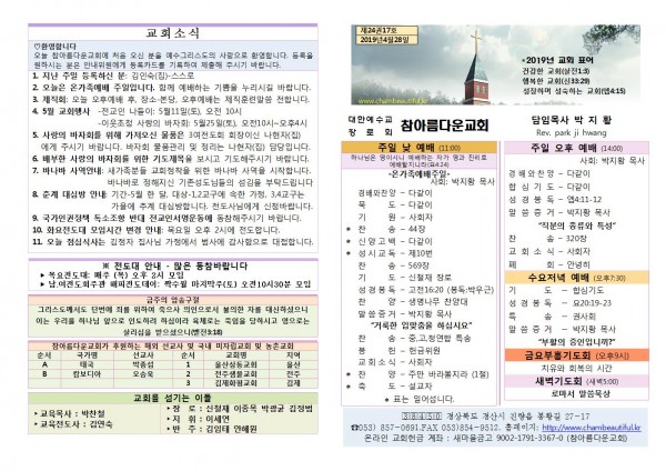 주보- 2019년 4월 28일 페이지 정보 작성자 참아름다운교회 댓글 0건 조회 10,746회 19-04-28 14:12 본문 주보- 2019년 4월 28일 목 록 답 변 이전글주보- 2019년 5월 5일 19.05.05 다음글주보- 2019년 4월 21일 19.04.23 댓글목록 댓글목록 등록된 댓글이 없습니다.